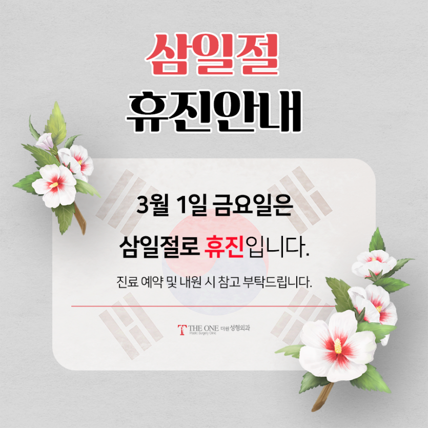 THE ONE PLASTIC SURGERY 공지사항 삼일절 휴진 안내 작성자 더원성형외과 답변 0건 조회 852회 작성일 24-02-23 10:07 3월 1일 금요일은 삼일절로 휴진입니다.진료예약 및 내원 시 참고 부탁드립니다. 목록 이전글 선거일 휴진 안내 24.04.03 다음글 성탄절 휴진 안내 23.12.07