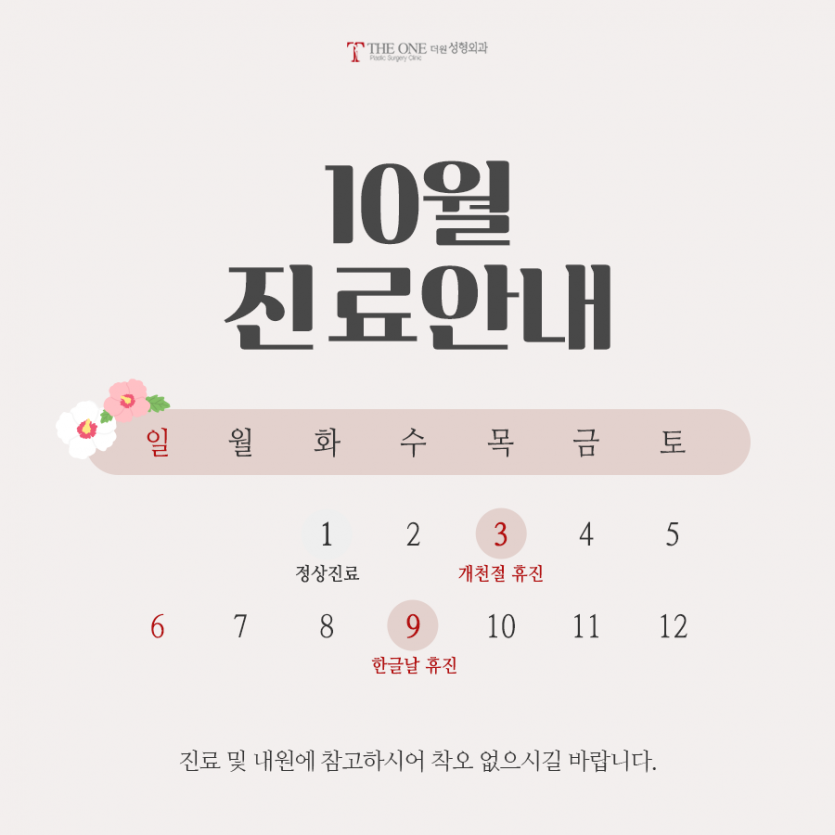 10월 진료 일정 작성자 더원성형외과 답변 0건 조회 434회 작성일 24-09-23 18:12 10월 1일(화)은 정상진료이며,10월 3일(목) 개천절 및 10월 9일(수) 한글날은 휴진입니다.진료 및 내원에 참고하시어 착오 없으시길 바랍니다. 목록 이전글 성탄절 휴진 일정 24.11.28 다음글 추석연휴 휴진 안내 24.08.27