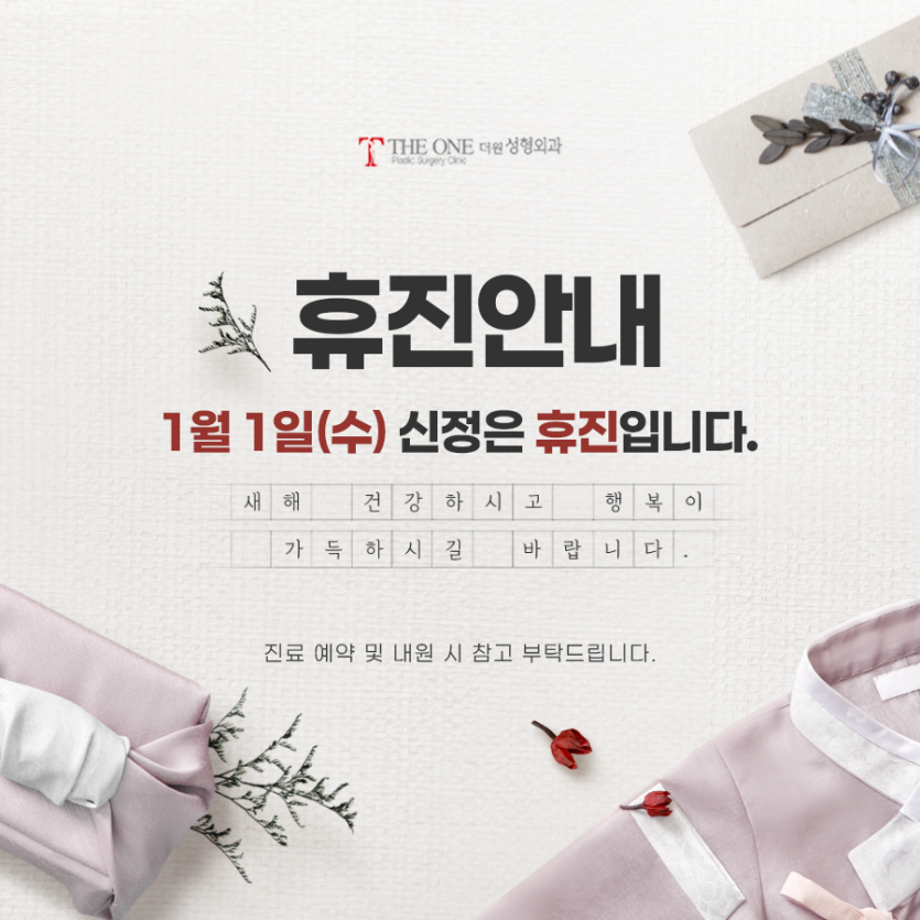 THE ONE PLASTIC SURGERY 공지사항 신정 휴진 안내 작성자 더원성형외과 답변 0건 조회 270회 작성일 24-12-24 15:25 1월 1일 수요일 신정은 휴진입니다.진료 예약 및 내원 시 참고 부탁드립니다. 목록 이전글 설 연휴 휴진 안내 25.01.07 다음글 성탄절 휴진 일정 24.11.28