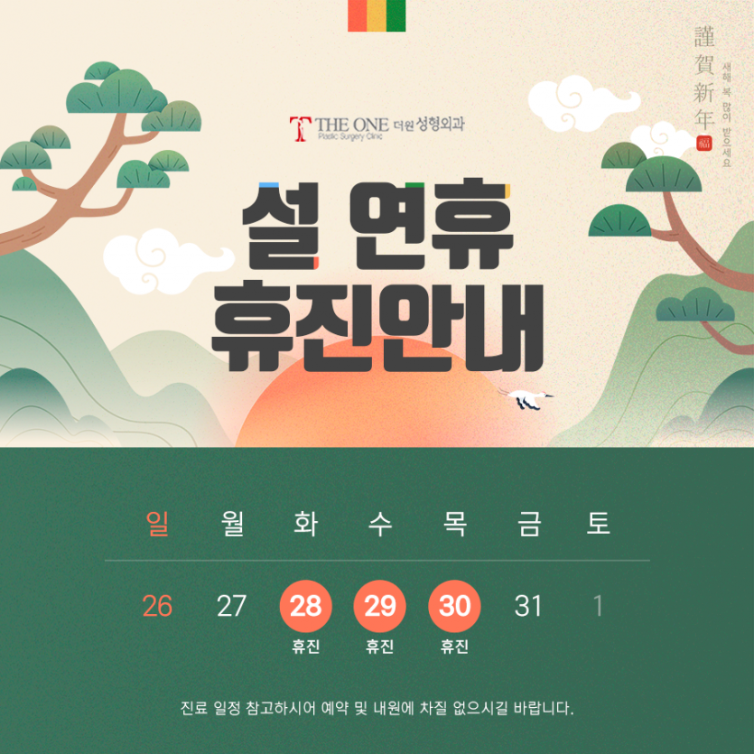 THE ONE PLASTIC SURGERY 공지사항 설 연휴 휴진 안내 작성자 더원성형외과 답변 0건 조회 289회 작성일 25-01-07 14:39 1월 28일(화) ~ 1월 30일(목) 설 연휴 휴진입니다.진료 예약 및 내원 시 참고 부탁드립니다. 목록 이전글 3월 진료 일정 25.02.12 다음글 신정 휴진 안내 24.12.24