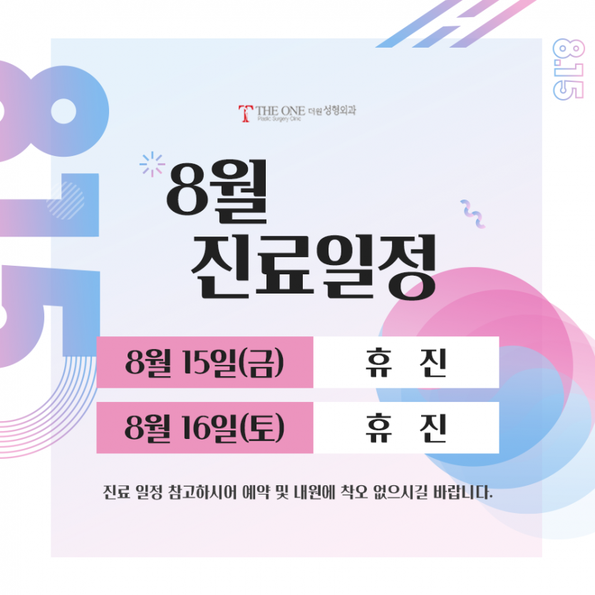 THE ONE PLASTIC SURGERY 공지사항 광복절 휴진 안내 작성자 더원성형외과 답변 0건 조회 155회 작성일 25-08-08 09:41 8월 8일(금) 광복절은 휴진입니다.진료 일정 참고하시어 예약 및 내원에 착오 없으시길 바랍니다. 목록 다음글 6월 진료 일정 25.05.26