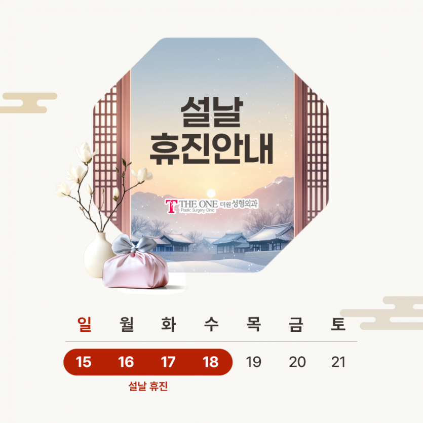 THE ONE PLASTIC SURGERY 공지사항 설연휴 휴진 안내 작성자 더원성형외과 답변 0건 조회 199회 작성일 26-02-03 10:12 2월 15일(일) ~ 2월 18일(수)은 설 연휴 휴진입니다.진료 일정 참고하시어 예약 및 내원에 착오 없으시기 바랍니다. 목록 이전글 3월 휴진 안내 26.02.23 다음글 신정 휴진 안내 25.12.26