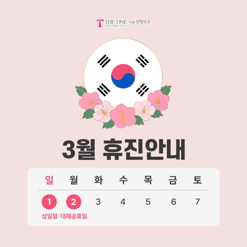 THE ONE PLASTIC SURGERY 공지사항 3월 휴진 안내 작성자 더원성형외과 답변 0건 조회 131회 작성일 26-02-23 15:04 3월 1일(일) 삼일절, 3월 2일(월) 대체공휴일은 휴진입니다.진료 일정 참고하시어 예약 및 내원에 착오 없으시기 바랍니다. 목록 다음글 설연휴 휴진 안내 26.02.03